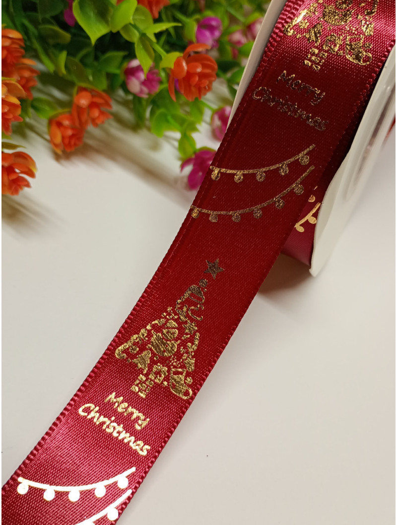 Атласна стрічка/Merry Christmas бордо/2.5 см/1 метр