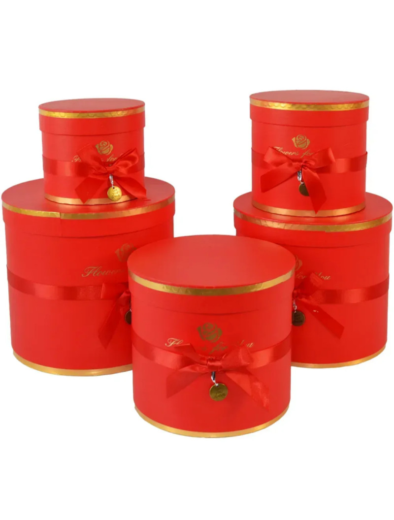Коробка циліндр/5 в 1/червоний. Розмір 1) 22,5*22,5*19,5см 2) 20,5*20,5*18см 3)18,5*18,5*16,5см 4)16,5*16,5*15см 5) 14,5*14,5*13,5см
