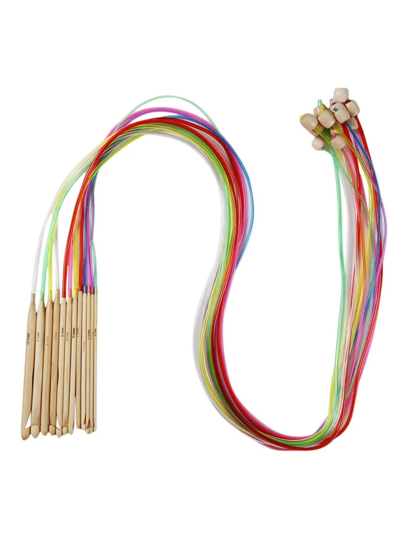 ✨ Опис: Створюйте унікальні вироби з цим зручним набором гачків! Кожен гачок виготовлений з високоякісного бамбука з гладкою поверхнею, а гнучка порожня волосінь довжиною 120 см та зручна довжина самого гачка (15 см) роблять процес в’язання максимально комфортним.
