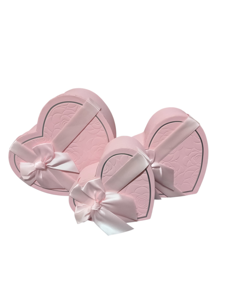 Набір коробок "серце"/рожевий із тисненням/3 в 1. Розміри: 1) 21.5×20×9 см. 2) 18.5×17×7.5 см. 3) 15.5×14×6 см.