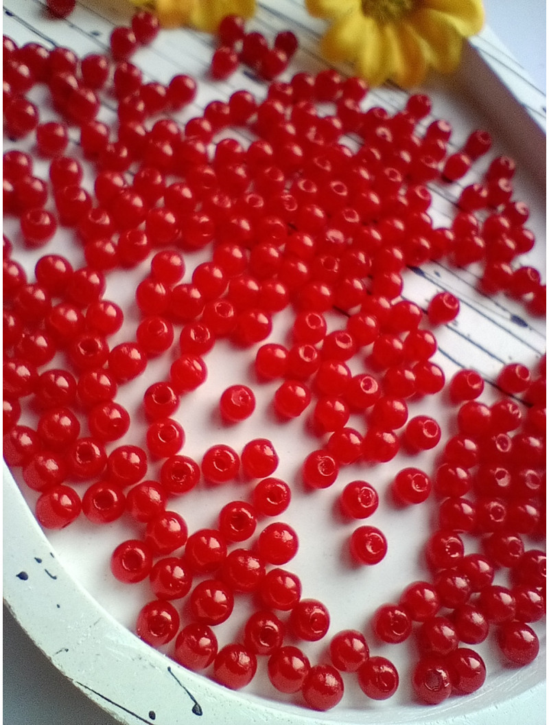 Пластикові намистини люкс. Розмір — 4 мм. Колір червоний. Паковання — 5 грамів (приб.161 шт.)