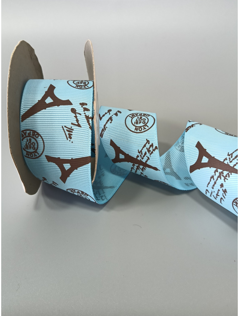Репсова стрічка. Ширина  4 см. Колір  чорні вежі на блакитному тлі. Ціна вказана за 1 метр