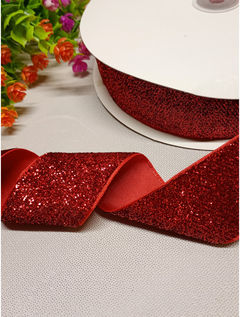 Бархатная лента с люрексом / 4 см / красный/ 1 метр