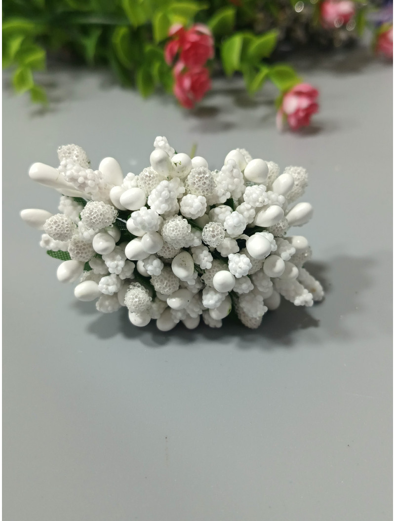 Тичинки "незабудка" на дроті з листиками. Ціна за букет. Колір білий Добавка до букетів — тичинки на дроті складні з ягодами та листям "Незабудка" Тичинки на дроті складні "Незабудка" домішки до букетів Ціна за 1 букетик (12 веточек) Кожен букет тичинок складається з 12 дротяних стібків, обмотаних папером. Кожен вистіб прикрашений тканинними листками та декількома тичинками (глянсові, цукрові та з дрібними шишечками) Завдяки таким різним формам тичинки мають дуже майстерно та натуральний вигляд Висота букета з дротом 9 см