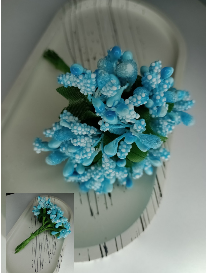 Тичинки "незабудка" на дроті з листиками. Ціна за букет. Колір блакитний. Добавка до букетів — тичинки на дроті складні з ягодами та листям "Незабудка" Тичинки на дроті складні "Незабудка" домішки до букетів Ціна за 1 букетик (12 веточек) Кожен букет тичинок складається з 12 дротяних стібків, обмотаних папером. Кожен вистіб прикрашений тканинними листками та декількома тичинками (глянсові, цукрові та з дрібними шишечками) Завдяки таким різним формам тичинки мають дуже майстерно та натуральний вигляд Висота букета з дротом 9 см