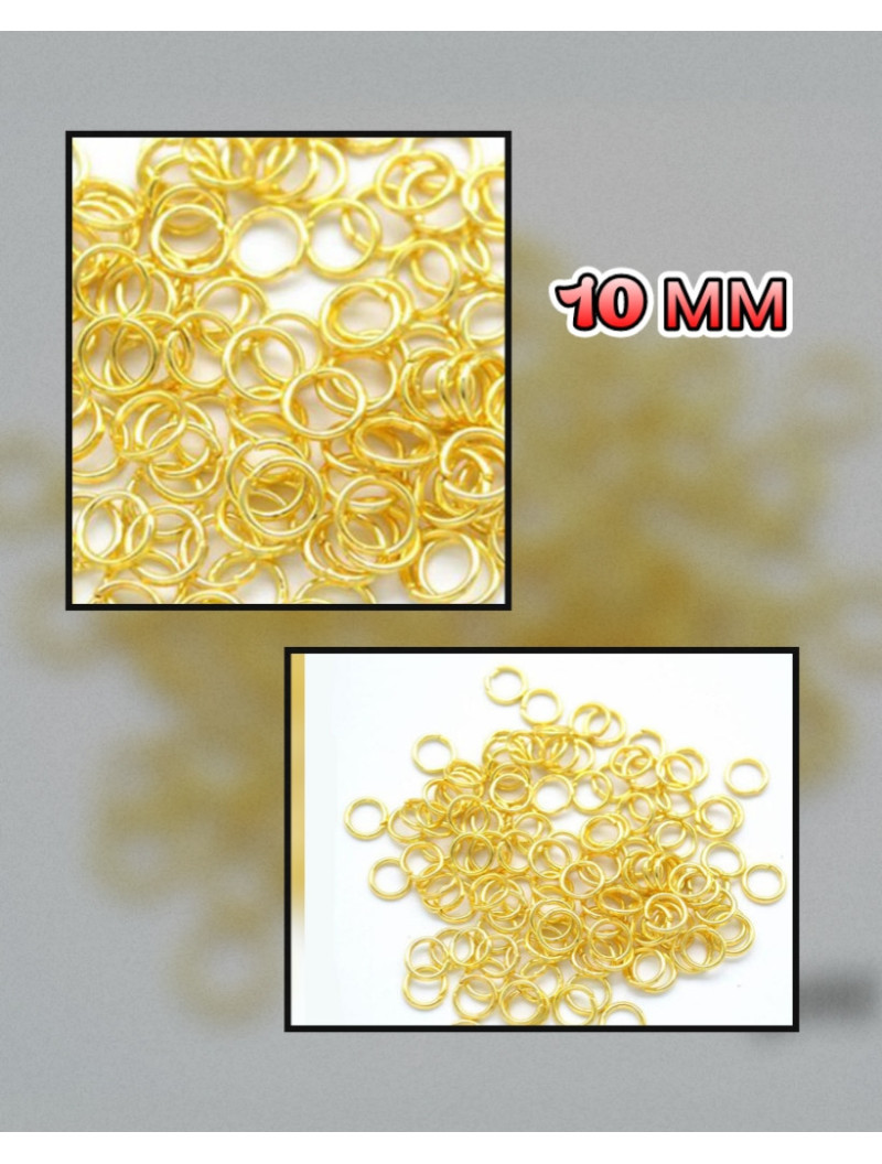 З'єднувальні кільця. Розмір — 10 мм. Колір — лимонне золото. Паковання 5 грам (приб.34 шт.). З'єднувальні кільця потрібні практично в будь-яких видах біжутерії, наприклад: під час створення замочок, підвісок, сережок тощо. Цей елемент виконує тільки одну, але найважливішу функцію — це поєднання елементів між собою. Різноманітність фурнітури для біжутерії дає змогу самостійно створювати будь-які прикраси. Для виготовлення браслетів, кілець, гумок для волосся й брелоків необов'язково мати професійні навички, все, що потрібно — фурнітура для біжутерії, гарні окремі елементи, заготівки та основи, і трохи фантазії та терпіння.